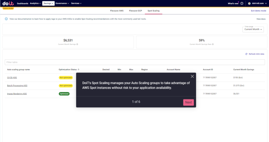 Given these risks and the effort involved, many practitioners choose to not even bother with Spot Instances. But DoiT Spot Scaling automates this process to remove the risk of interruptions and help to reliably run your workloads using Spot Instances. The tool automatically analyzes your ASGs to recommend best practice configurations, then replaces on-demand instances with the heavily discounted Spot Instances when applicable. And to eliminate the risk involved, Spot Scaling provides fallback to on-demand for situations where there isn’t any spot capacity in the market.