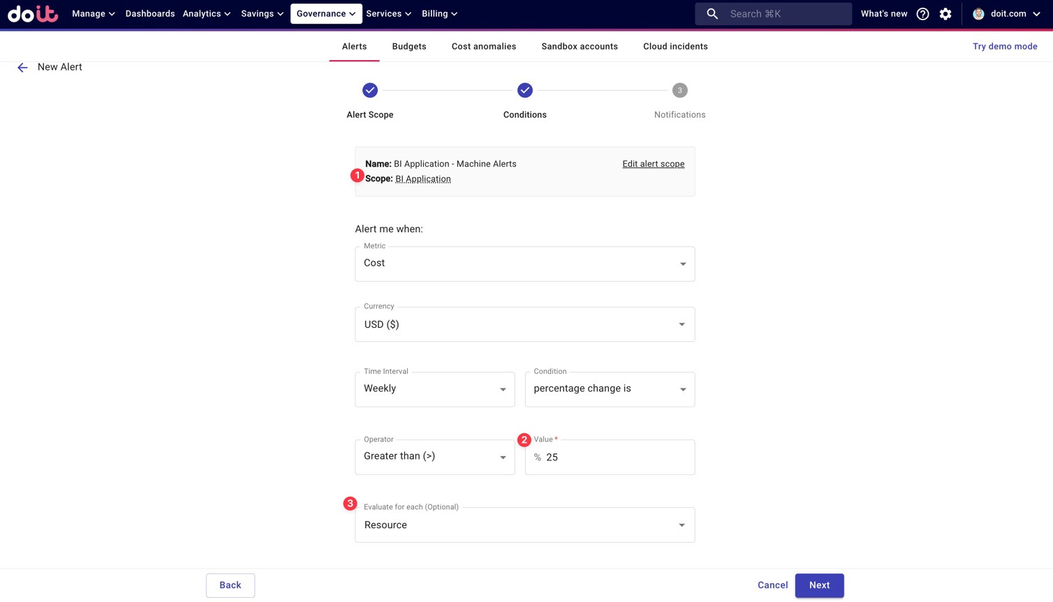 Let’s say we wanted our Engineering Lead to be notified when any resource — an S3 bucket, for instance — associated with the BI Application increases 25% week-over-week. This could give them an early warning of a potentially unanticipated increase in compute costs.