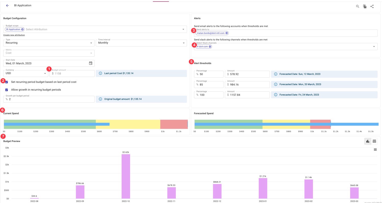 - Set our budget amount (and view the previous month’s BI Application costs for context)