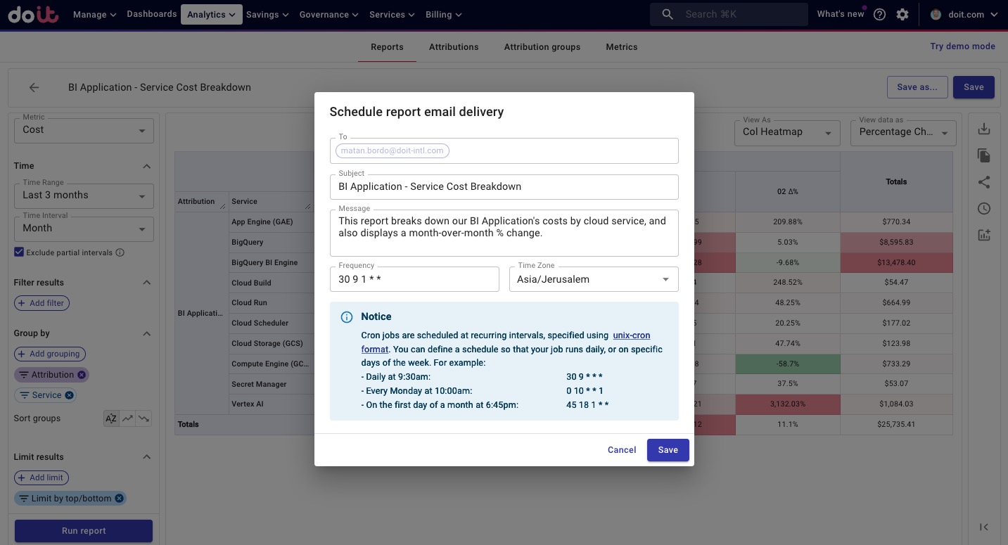 If this is the case, you can build these types of reports for them, and schedule them to be delivered at a regular interval. This way, you’ll make stakeholders more aware of their cloud costs on their terms, instead of asking them to learn a new tool right away.