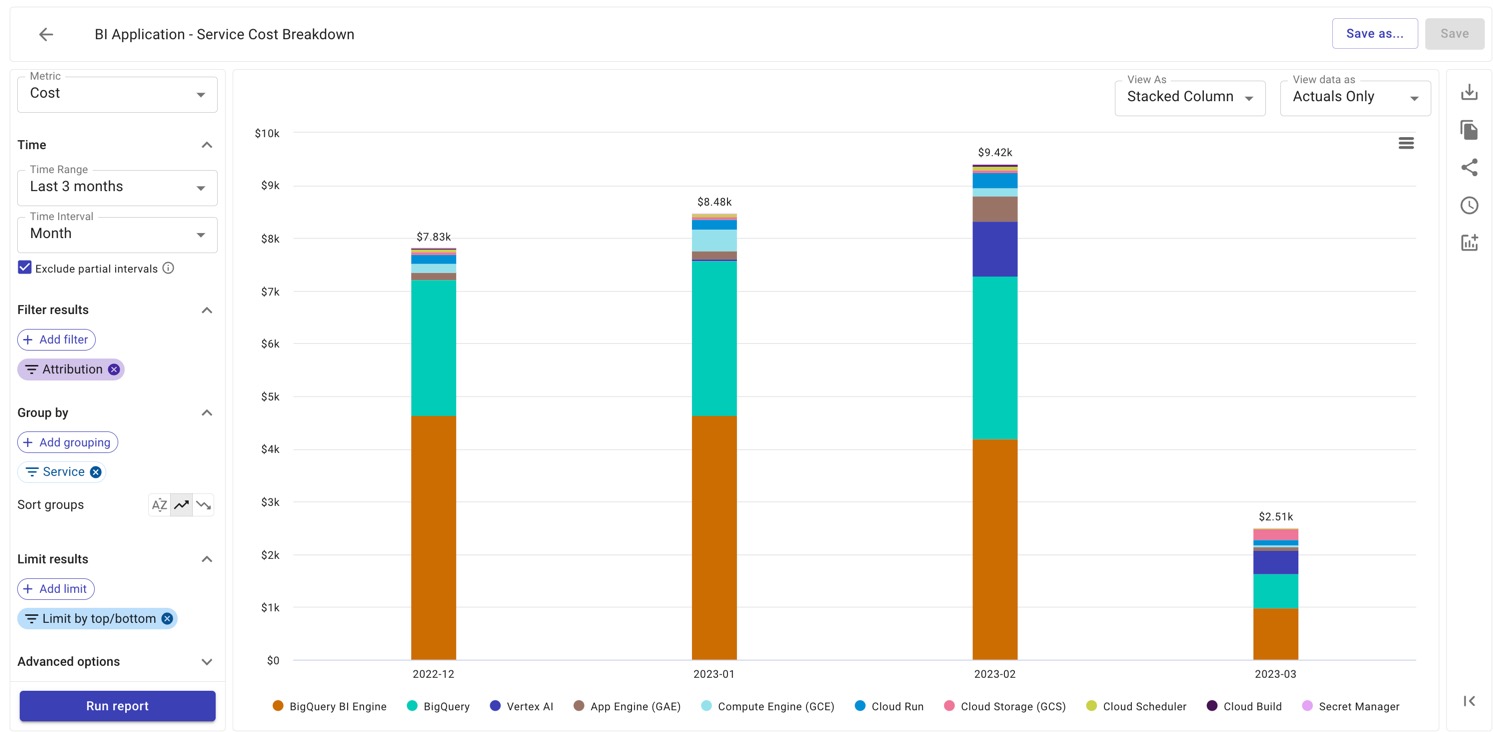 As Engineering Lead, Alex has been tasked to manage their company's Business Intelligence (BI) application.. To understand costs more deeply, Alex groups cloud resources used by the BI application with an Attribution. In the example below, BI Application costs are defined as any resources tagged with a “team” label or project label value corresponding to “BI Application”."