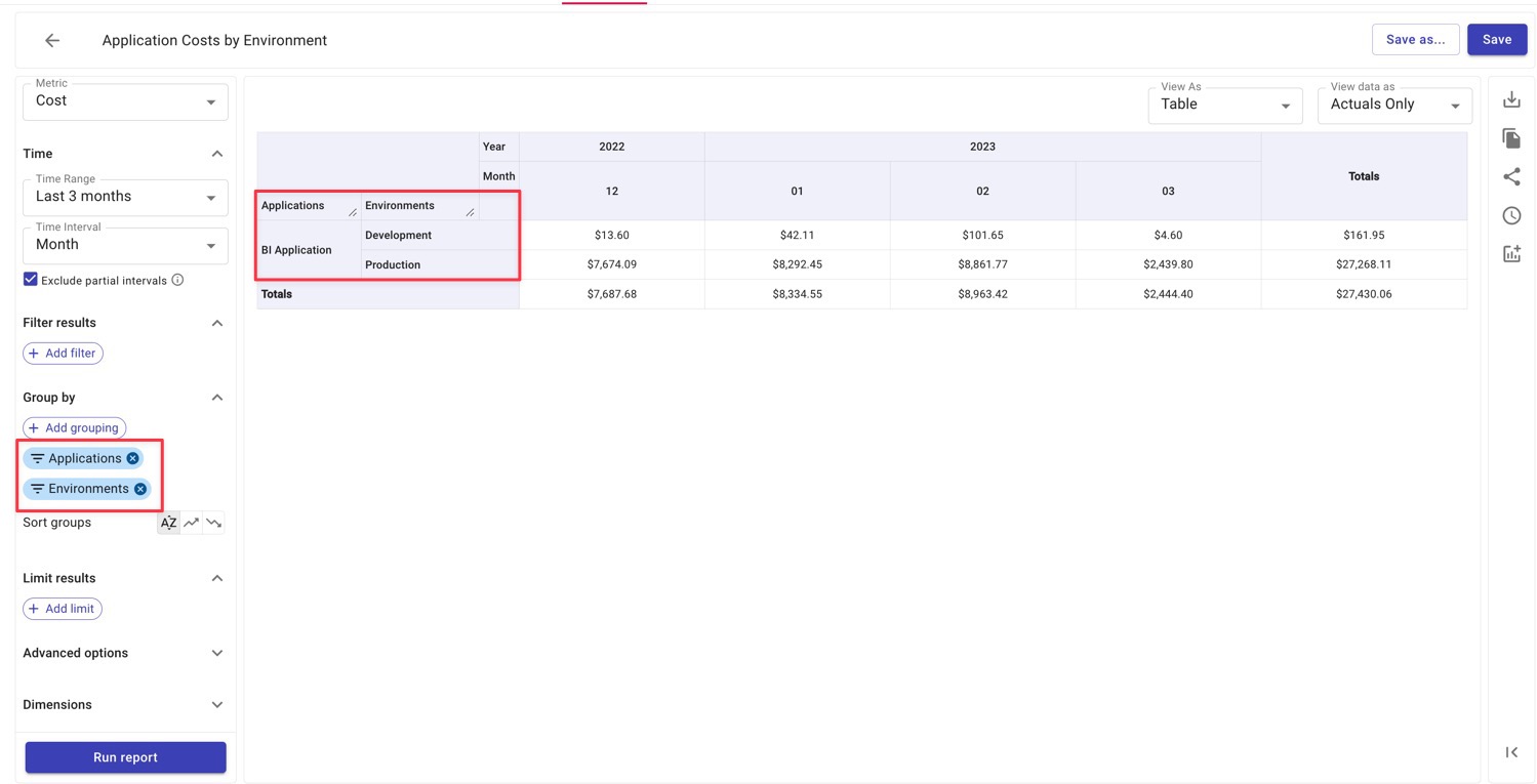 Once these Attribution Groups have been created, you can use them in Reports to break down one group’s cost by another group. Below we can our BI Application’s costs broken down by environment, which were also defined using Attributions.
