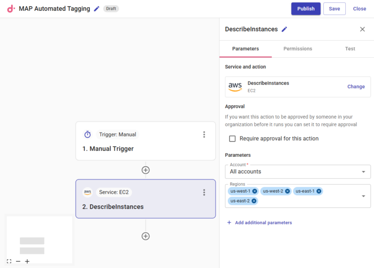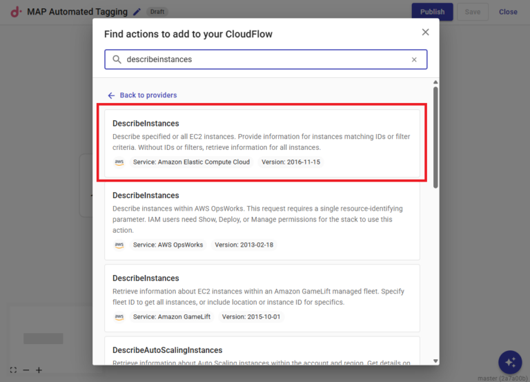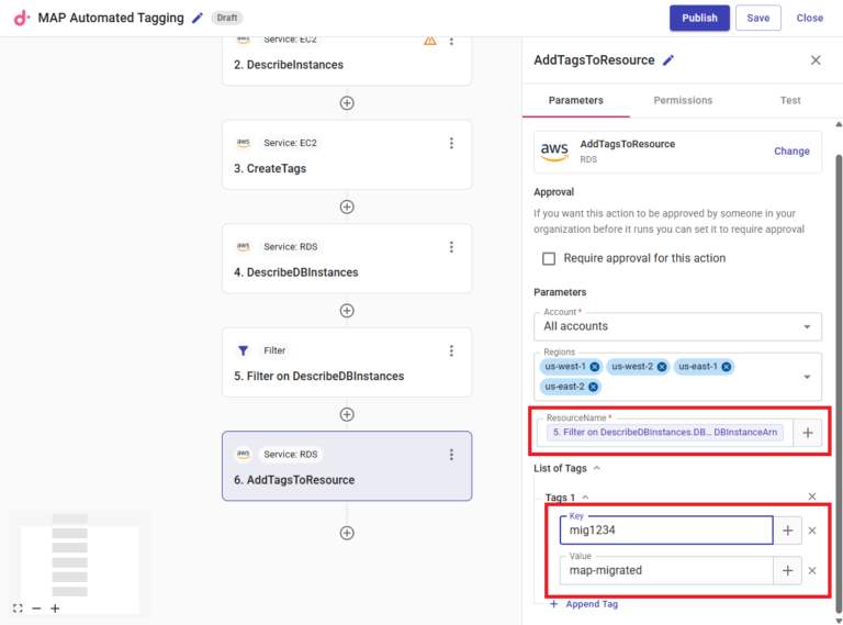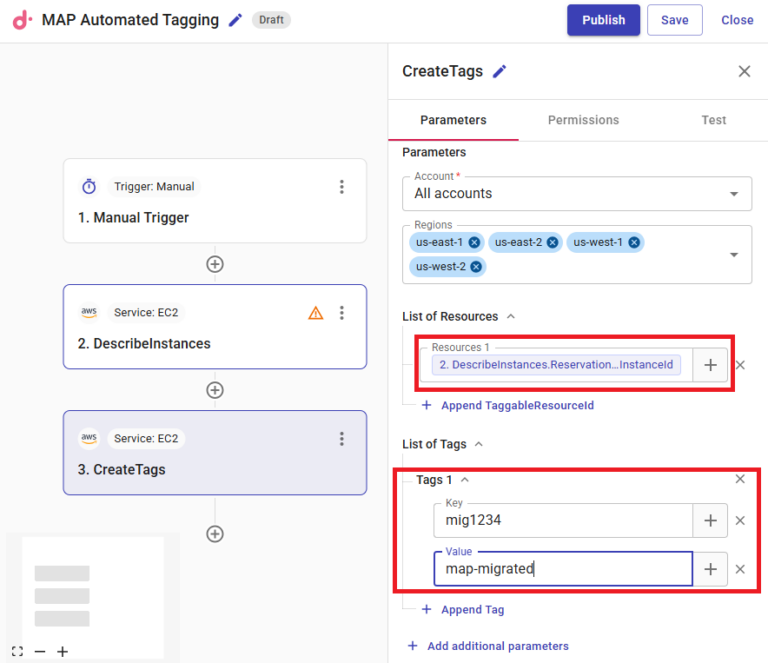 Once that's done, you just click publish to run the CloudFlow. You can see the tag getting added to your EC2 and RDS instances that you launched today, as well as any other workloads that you launch after today’s date. To ensure all the EC2 and RDS instances are tagged with the map-migrated tag after today’s date, you can also schedule the CloudFlow to run daily.