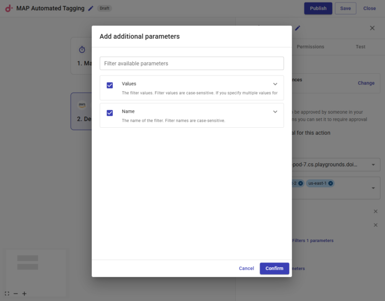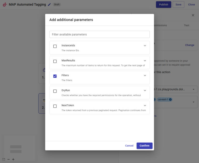 To configure this step, you'll select the string from the previous filter step as the Resource Name, and then add another Key and Tag that aligns with your previous ones for the EC2 instances.