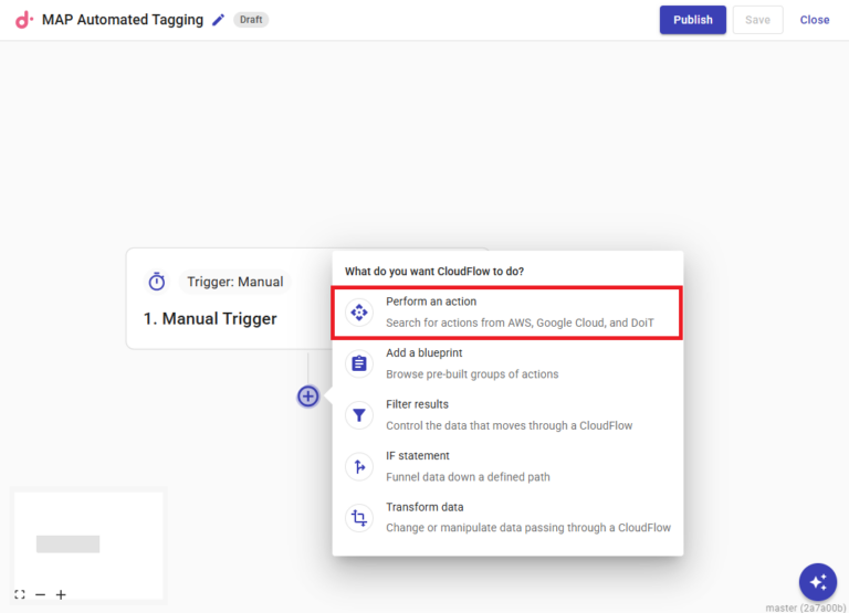 You can name the CloudFlow just by clicking in the text bar top left next to the DoiT logo. CloudFlow has two ways to trigger as below. For this demo we will be doing Manual Trigger: