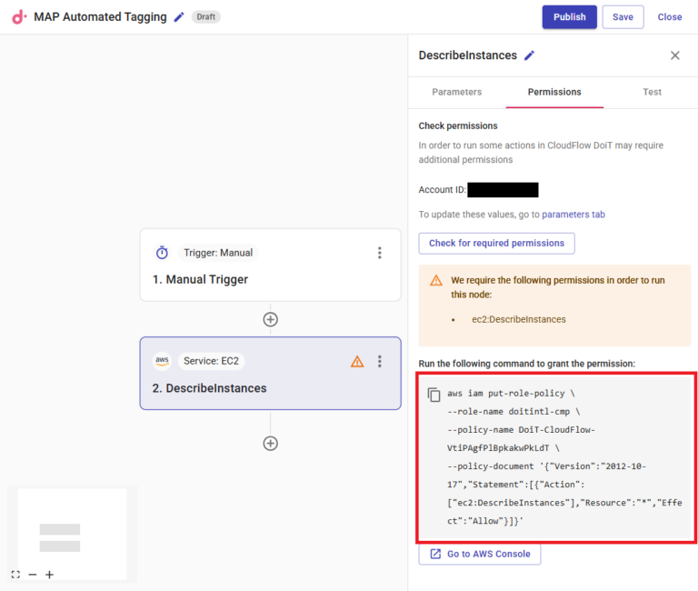 In the permission tab when you click on “Check for required permissions” CloudFlow uses a role named “doitintl-cmp” (this role is created when you attach your AWS Account to CloudFlow; to learn more into how to attach an AWS Account to CloudFlow, you can read the detailed documentation here). CloudFlow will check for required permission to run that API call and if it is unavailable, it will create an AWS cli command for you.