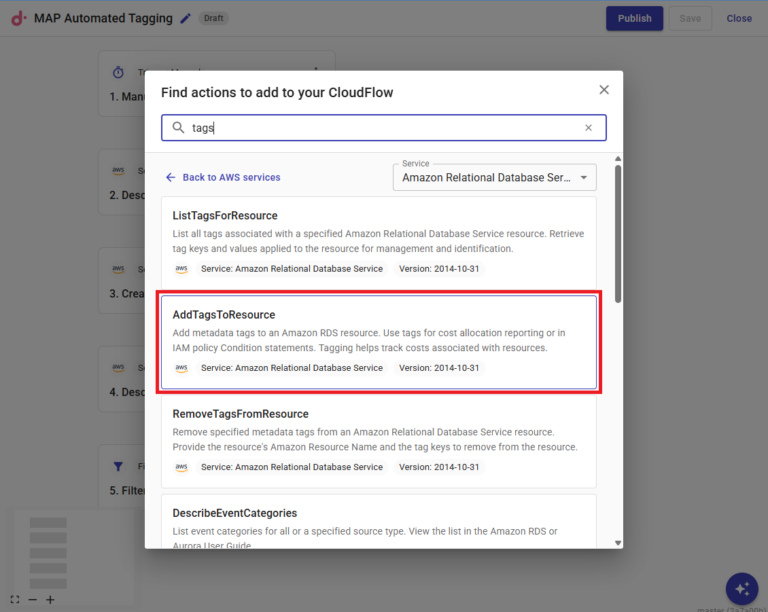 Now that's done, all that's left is to add the newly created tag to the RDS instances, and then run your CloudFlow. Go back to the workflow and add one final API call, this time named 'AddTagsToResource' for Amazon RDS.
