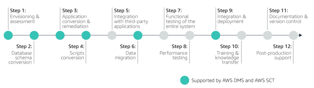 How do AWS DMS and AWS SCT fit into your migration project? AWS suggests to structure a migration into 12 steps. As not all of the steps are required to every migration project— DoiT International assigns a migration specialist from the Database Engineering department to every customer project to assess your particular use case. Based on the initial assessments and the characteristics of your application, database, infrastructure, available resources, and skill sets DoiT International will build a migration plan together with you.
