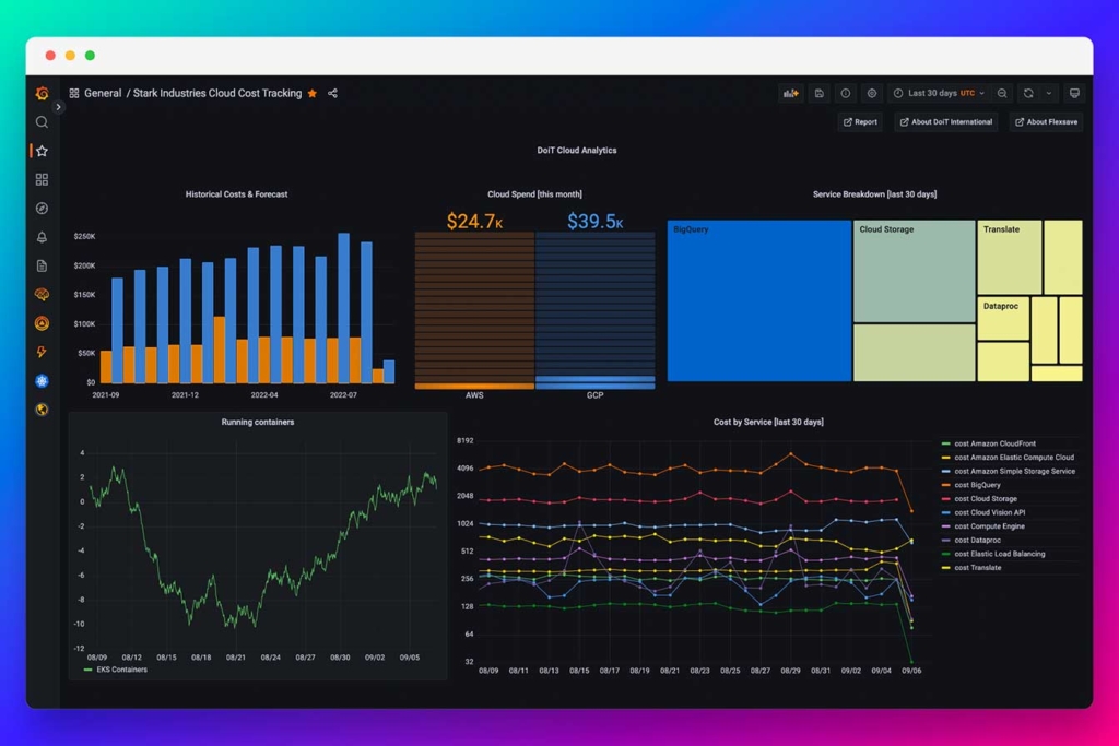 DoiT's Cloud Analytics platform allows you to build advanced cloud expenditure reports and share them with your team. You can group resources and their associated costs with custom attributions, detect and analyze trends, forecast your cloud costs and manage your budgets without having to spend agonizing hours manually scanning cloud bills. Likewise, for visualizing time-series data, Grafana is the way to go: For monitoring, alerting, or analysis. Grafana supports many popular time-series data sources such as Prometheus, InfluxDB, Graphite, Elasticsearch and many others.
