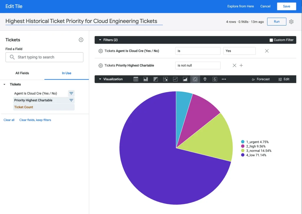 Let’s dive straight into another example. Assume a person in a leadership role is keen to understand the proportion each ticket priority represents out of the total tickets assigned to the engineering team. More precisely, they are interested in identifying the highest priority level that a ticket has reached during any stage of its lifecycle which is handled by engineers.