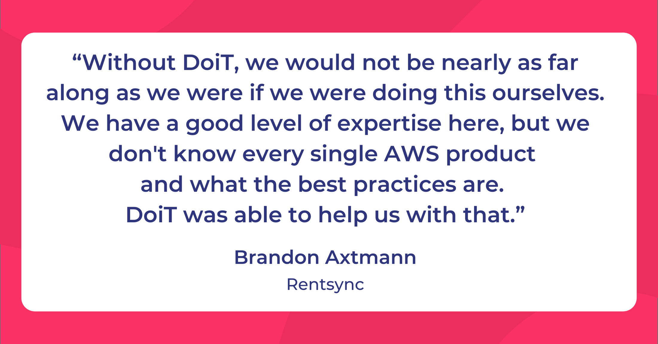 DoiT’s knowledge of cloud infrastructure and AWS allows Rentsync to avoid costly mistakes and speed up progress. It also frees up a lot of focus and time for their internal team. Says Brandon, “We’re not having to research random things with AWS, not having to troubleshoot something that we have no idea about or banging our heads against the wall. We’re offloading a lot of this work to DoiT.”