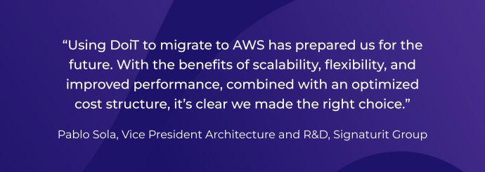 DoiT was also able to help guide Signaturit Group to participate in the AWS Migration Acceleration Program (MAP), which helped provide resources to make the migration more affordable. “The MAP certainly helped us accelerate the project,” says Sola. “It made it possible to plan a smoother migration and reduce the risk of having to rush any part of the move. The value of a migration to AWS was always there and we would have done it regardless, but the MAP resources really helped.”