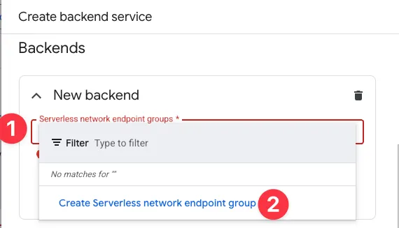 Desplázate hasta el área Backends. En Nuevo backend, haz clic en Grupos de puntos finales de red sin servidor y haz clic en Crear grupo de puntos finales de red sin servidor.