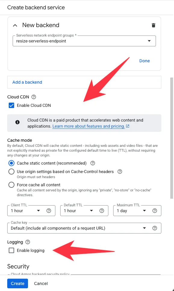 En la página backend, podemos configurar los ajustes de la caché Cloud CDN: