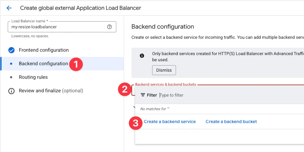 Haz clic en Configuración del backend, y en el cuadro Servicios de backend y cubos de backend, haz clic en Crear un servicio de backend.