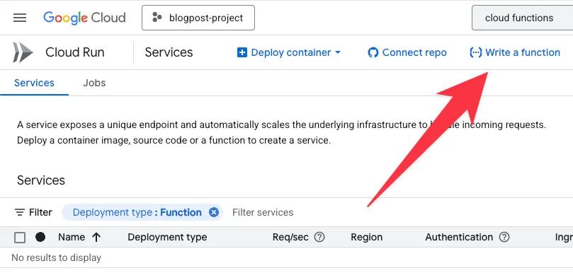 El siguiente paso es crear una función. Ve a la consola Funciones en la Nube y haz clic en Escribir una función.