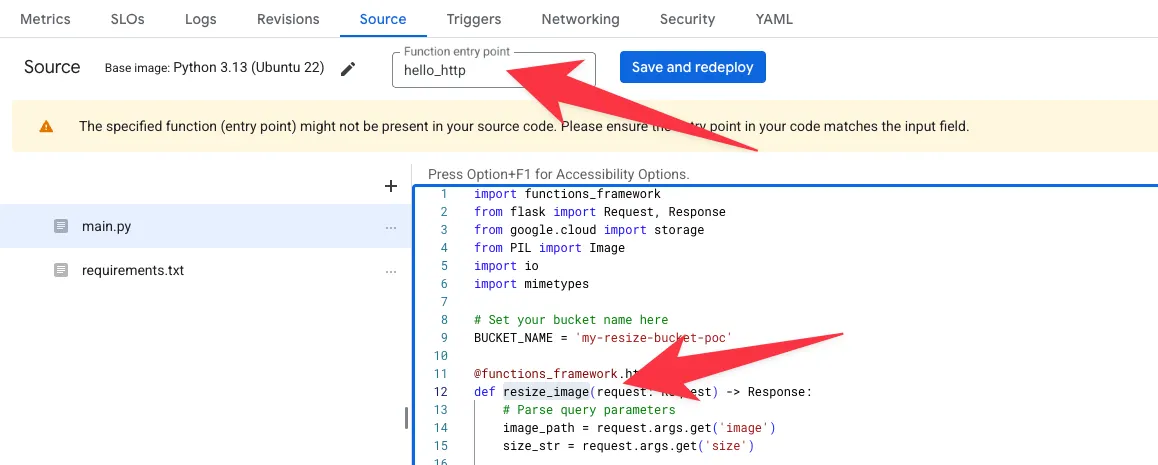 Cuando actualizamos el código en main.py y las bibliotecas en requirements.txt, vemos una advertencia que dice "La función especificada (punto de entrada) podría no estar presente en tu código fuente. Por favor, asegúrate de que el punto de entrada en tu código coincide con el campo de entrada".