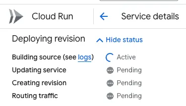 Cloud Functions construye el contenedor de nuestro código. Puede tardar un par de minutos, y podemos seguir el estado de la construcción en la parte superior del panel de control: