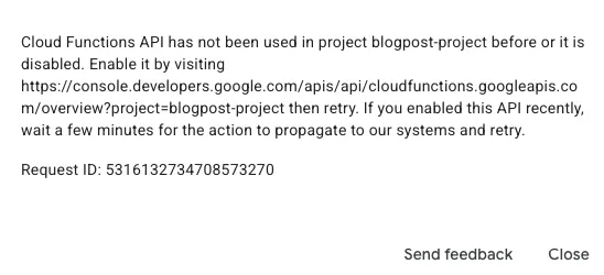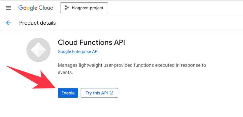 Si es la primera vez que utilizas Cloud Functions, puede que veas el mensaje "La API de Cloud Functions está habilitada". Esto significa que las funciones de Cloud Functions se están habilitando en tu proyecto sin coste adicional.