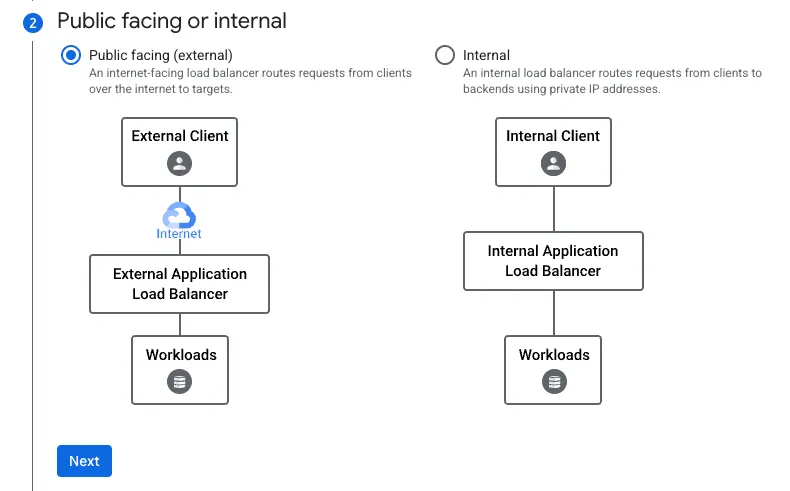 Queremos que nuestros usuarios de todo el mundo puedan acceder al equilibrador de carga, así que elegimos Public Facing (externo):