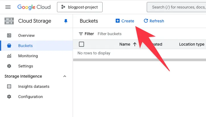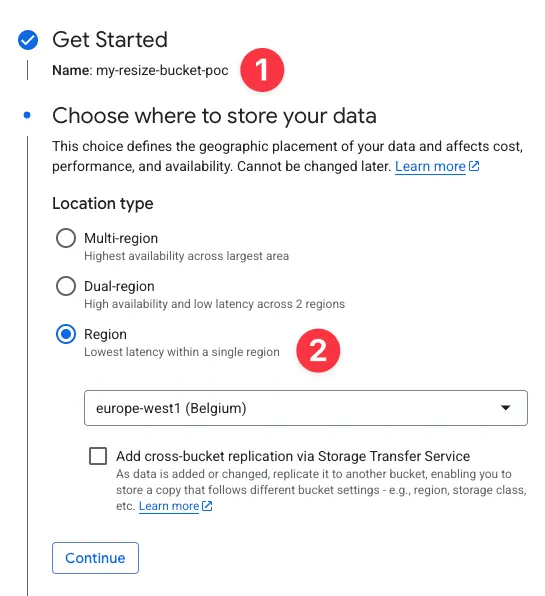 Establecemos un nombre para el cubo y configuramos una ubicación regional, y hacemos clic en el botón Crear: