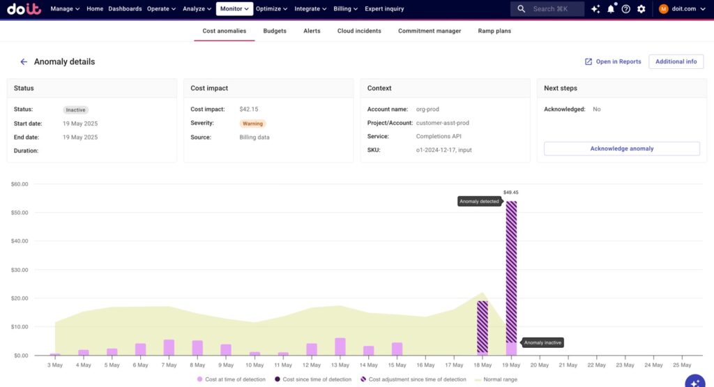 Anomalía de costes detectada para la API de Finalizaciones de OpenAI en la consola DoiT