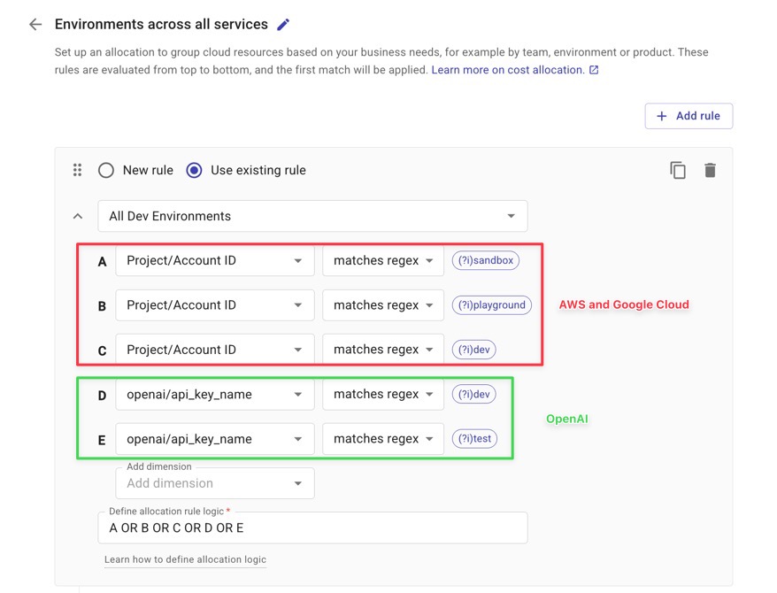 También puedes combinar los datos de OpenAI con otras fuentes de costes para crear asignaciones más completas. En el siguiente ejemplo, estamos agrupando todos los costes del entorno de desarrollo -definidos con regex- en AWS, Google Cloud y OpenAI en una única fuente de costes. "Todos los entornos de desarrollo" asignación.