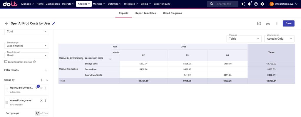 Informe en DoiT Cloud Intelligence que desglosa los costes de producción de OpenAI -definidos con Asignaciones- por usuario