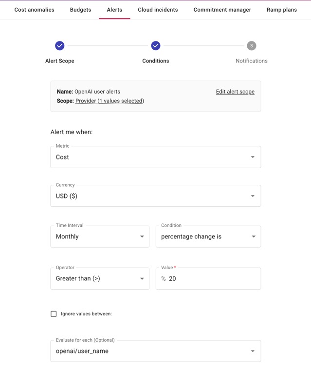 Por último, también puedes aprovechar los atributos de OpenAI en Alertas para supervisar de forma proactiva tus patrones de gasto en OpenAI y recibir notificaciones de cambios inusuales en los costes.