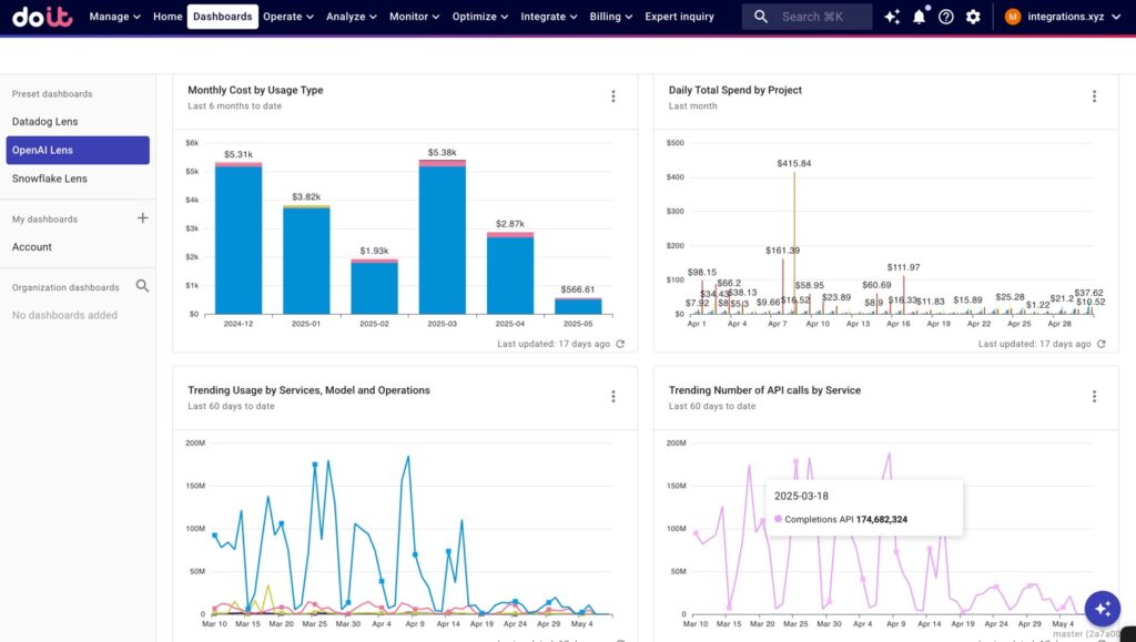 Por eso presentamos la integración OpenAI para DoiT Cloud Intelligence, que te permite ver tu OpenAI junto con tus costes de nube, herramientas SaaS y cualquier otro cualquier otro coste en un solo lugar, facilitando a los equipos de FinOps e ingeniería el seguimiento, la gestión y la optimización de las inversiones tecnológicas completas.